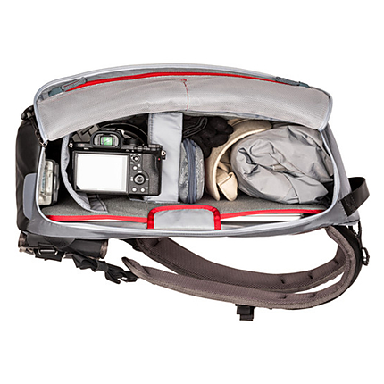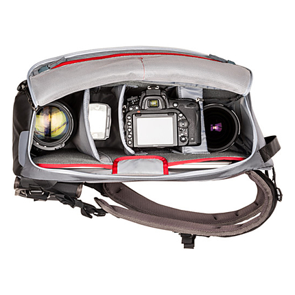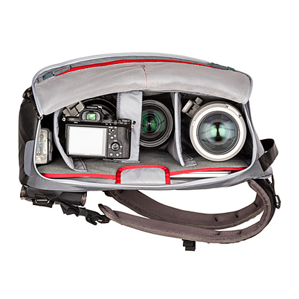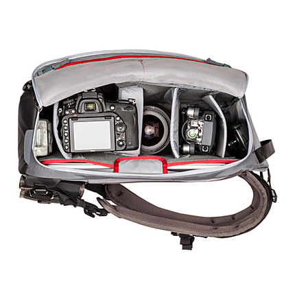 The MindShift PhotoCross 15 Backpack (Carbon Grey) is designed to provide a snug fitting backpack that can be rotated from your back, to your front, for easy access to your camera equipment. You can also reach the camera compartment via a top-facing zippered panel, with a 180° upward opening. The inside of the zippered panel includes two zippered, mesh pockets which can be used for organizing & storing camera batteries, small electronics, & memory cards. The side of the backpack that rests against your back includes a slip pocket, with room for a 15" laptop. Five adjustable/removable dividers are included to organize everything to meet your needs.