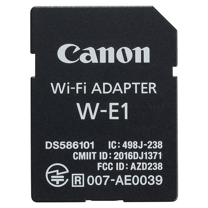 Enable WiFi connectivity in your Canon EOS 5DS, 5DS R, and 7D Mark II cameras with the Canon W-E1 WiFi Adapter. It operates on a 2.4 GHz band with a coverage range of up to 32.8 ft. This SD memory card-shaped adapter comes in handy when you need to transfer pictures and MP4 videos wirelessly to a computer, tablet, or smartphone. For added versatility, you can use this WiFi adapter for controlling the camera remotely by downloading the Camera Connect app from Canon. To initiate a wireless backup, this WiFi adapter is compatible with the CS100 Connect Station.