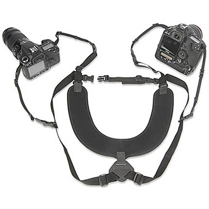 The DUAL HARNESS (X-Long) is a comfortable and versatile way to carry one or two cameras or binoculars. The unique U-shaped neoprene neck pad evenly distributes the weight of your gear while absorbing the shock of your movements. As the DUAL HARNESS uses the 3/8" connectors, your gear remains safely in the upright position at your sides. This keeps the camera stabilized and secured within your view and grasp. By also maintaining the camera in the upright position, no stress is put on your camera, lens or shoe-mount flash units. Your cameras can be quickly and easily brought to the proper shooting position with the self-gliding connectors.