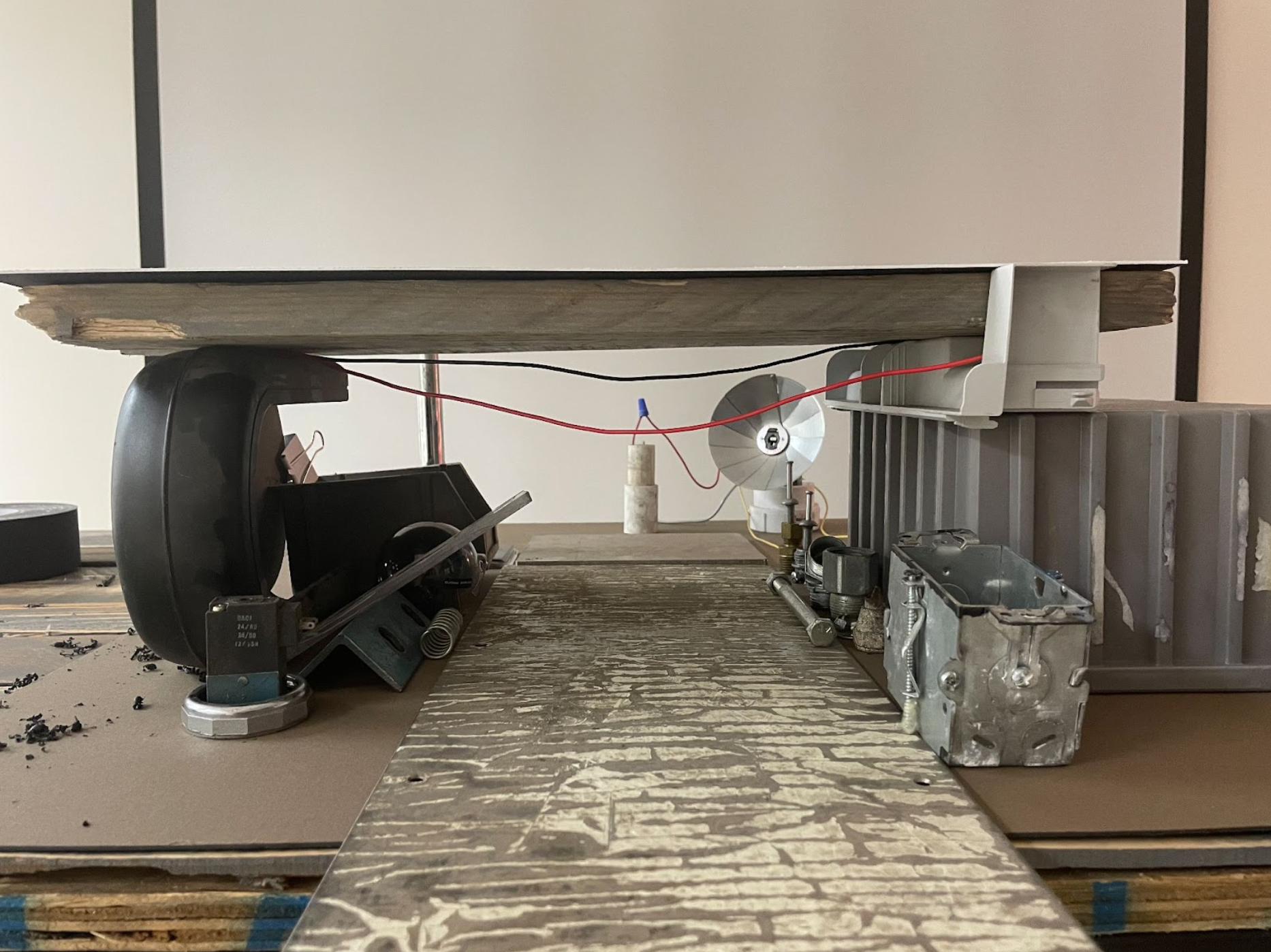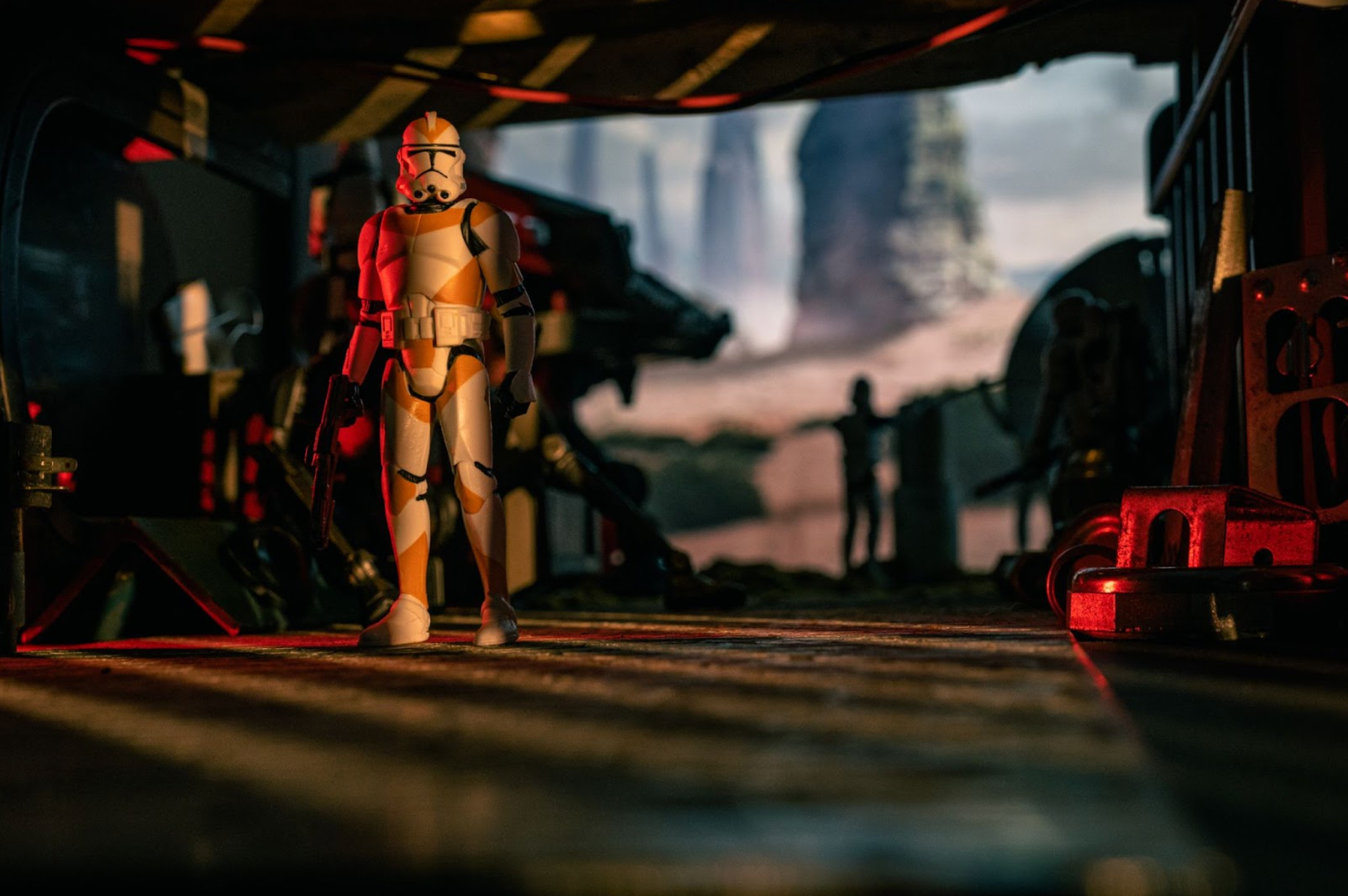 A story of a crashed spacecraft and its crew setting up comms to headquarters formed in my mind and I was on my way. I found random nuts, bolts, plastic bins, and even an old camera flash to create a diorama for the action figures borrowed from my nephew and a fellow Unique colleague. The background was a projected image that helped ground the set, and a bit of kinetic sand completed the corridor scene.