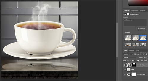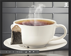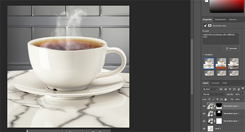 The prompt was apparently too specific, or perhaps the AI misunderstood what we meant, so we retyped the prompt to just "add tea and steam" so we could re-generate the material. It gave us three awesome results, each having a different steam effect and direction, as well as the tea color being slightly different this time around.