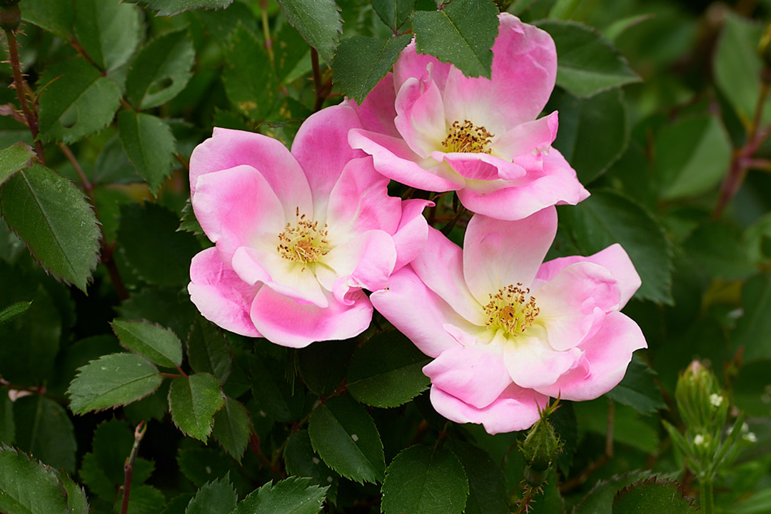 Photo of three pink flowers with green leaves surrounding them with some out of focus flowers in the background