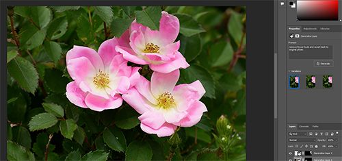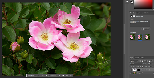 Looking at the flowers out of focus on the right hand side, they seem to not fit in as much anymore to this composition, so why not try to remove them altogether? After creating a selection around the whole section of out of focus flowers - we asked the AI to remove and replace them with leaves similar to the ones already in the image.