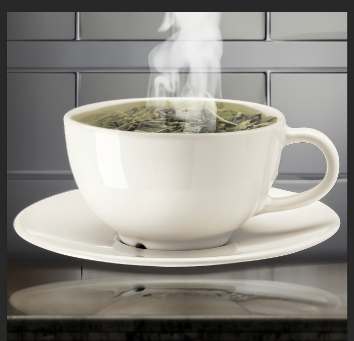 Out of the 3 results, 2 of them still kept the teacup reflection intact so we opted with the marble countertop dupe. That way it was even closer to representing something that could be recreated in a studio using V-Flat boards or a natural kitchen countertop.