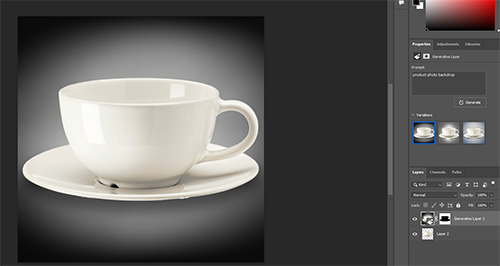 We initially got a simple gradient to start, so to specify to the AI the type of background we were looking for, we asked it to add a product photography backdrop. The results we got from this slight adjustment in the prompt definitely resulted in something that was closer to the end image we would want.