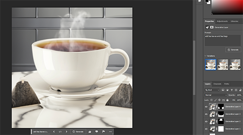 Now that are scene was coming together, the next step was to add some tea bags, as a secondary product. This addition now allows our "end goal" image to represent a "Tea Company" advertisment as it would display the tea and the tea cup itself. "Add tea bags and tea leaves" was typed into the prompt textbox and for the most part the result was consistent in showing different types of tea bags (i.e. triangular, flat, and square bags).