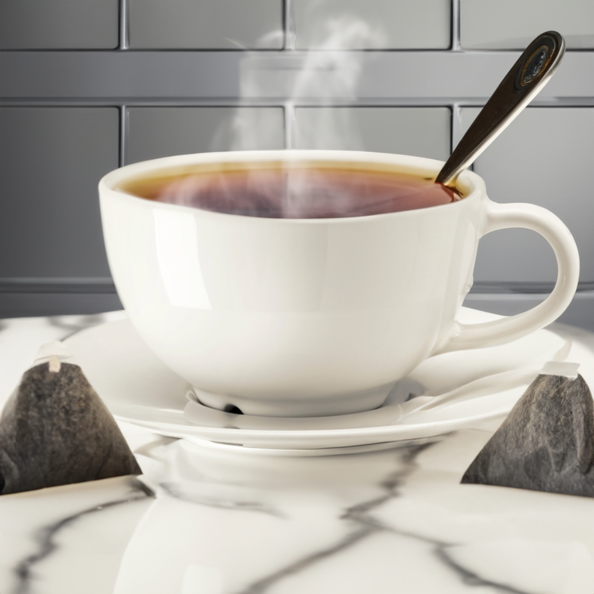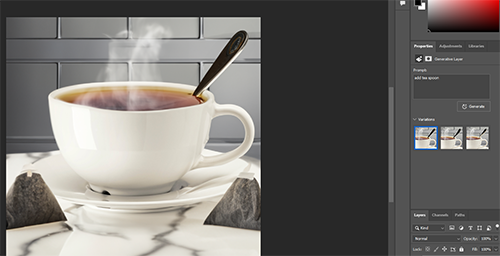 We opted for the nicer triangular bags, as they complimented the marbling in the countertop the best, and they also gave a nice balance to the image. The image we currently have not only has a great contrast, but easily represents something that could be replicated in a photo shoot - which was the type of result we were looking for. However, we did miss one little detail, like a cherry on a sundae, whats a cup of tea without a spoon to accompany it? So our final prompt in this test was to add a tea spoon to our cup.