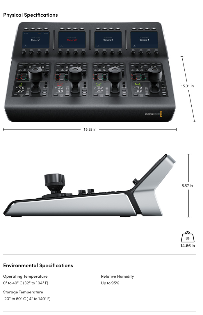 The ATEM Camera Control Panel provides independent controls for up to 4 URSA Mini, URSA Broadcast, Blackmagic Studio and Micro Studio cameras from a single control panel. You get iris control, shutter speed, white balance, master gain, pedestal, RGB controls for white and black, and more.