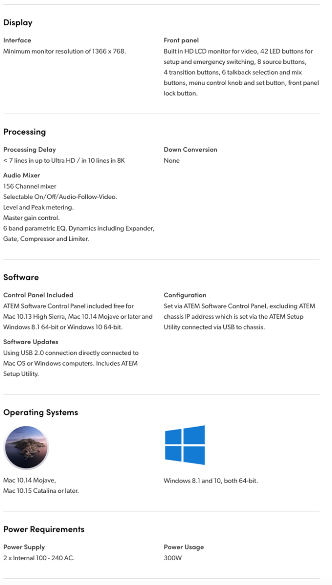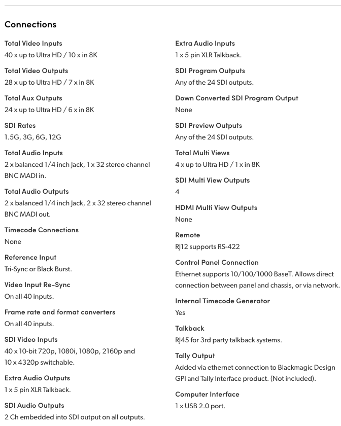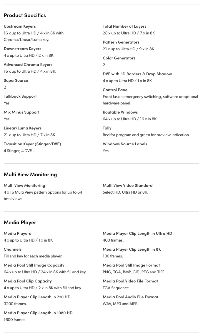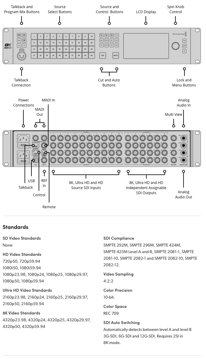 Ultra HD live production switcher with so many features, you can combine them all to make an incredibly powerful 8K switcher! This massive 4 M/E switcher features 40 12G-SDI inputs, 24 12G-SDI aux outputs, 4 DVEs, 16 ATEM Advanced Chroma Keyers, 4 media players, 4 independent Ultra HD multiviews, 2 SuperSource processors and even standards conversion on all inputs! When switched to work in 8K, all of these features are be combined to make a powerful native 8K switcher! You even get built in talkback and a professional 156 channel Fairlight audio mixer with EQ and dynamics!