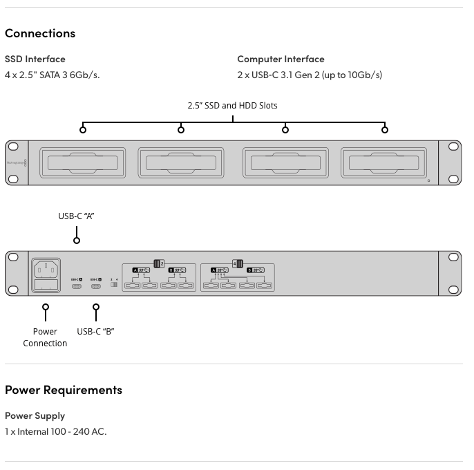 Advanced SSD dock with 4 separate SSDs that can be accessed via a single high speed 10 Gb/s USB-C connection. Specifically designed for the film and television industry, Blackmagic MultiDock 10G features a rack mount design with an independent SATA driver chip on each disk to ensure fast data transfer speeds. Can be connected directly to computers for editing directly from media disks and also used with HyperDeck Extreme 8K HDR for recording and playback.