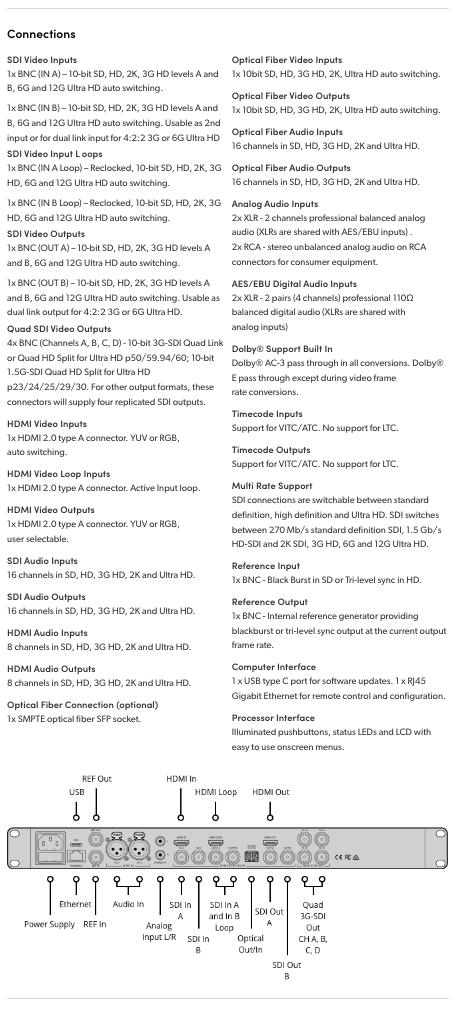 Teranex AV is specifically designed with new features for live events and professional AV installations, as well as broadcast and post production workflows. You get 1,089 up, down, cross and standards conversions for all formats up to 2160p60, along with Teranex’s patented algorithms and legendary image quality. Teranex AV offers low latency, and features a still store for adding logos and graphics, a live freeze frame and can generate a reference signal. You get professional 12G-SDI and quad SDI connections which can be used simultaneously, consumer HiFi, XLR audio, HDMI in, loop and outputs, and more! There are even metal brackets at the rear to prevent cables and connections from getting damaged when installed in tight locations!