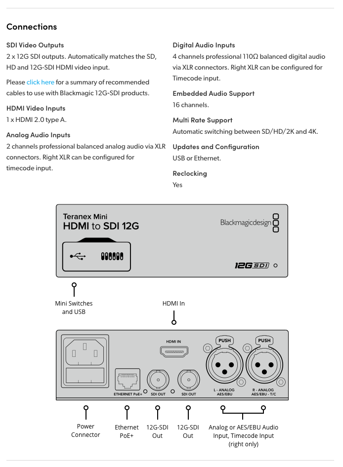 Convert from HDMI to 12G-SDI. Works with all video formats including SD, HD, 6G and 12G-SDI rates and includes an up converter for converting HD to Ultra HD. Embed audio from balanced analog or AES/EBU and timecode input. Ideal for converting HDMI consumer cameras to SDI, or adding SDI outputs to computers with HDMI connections.