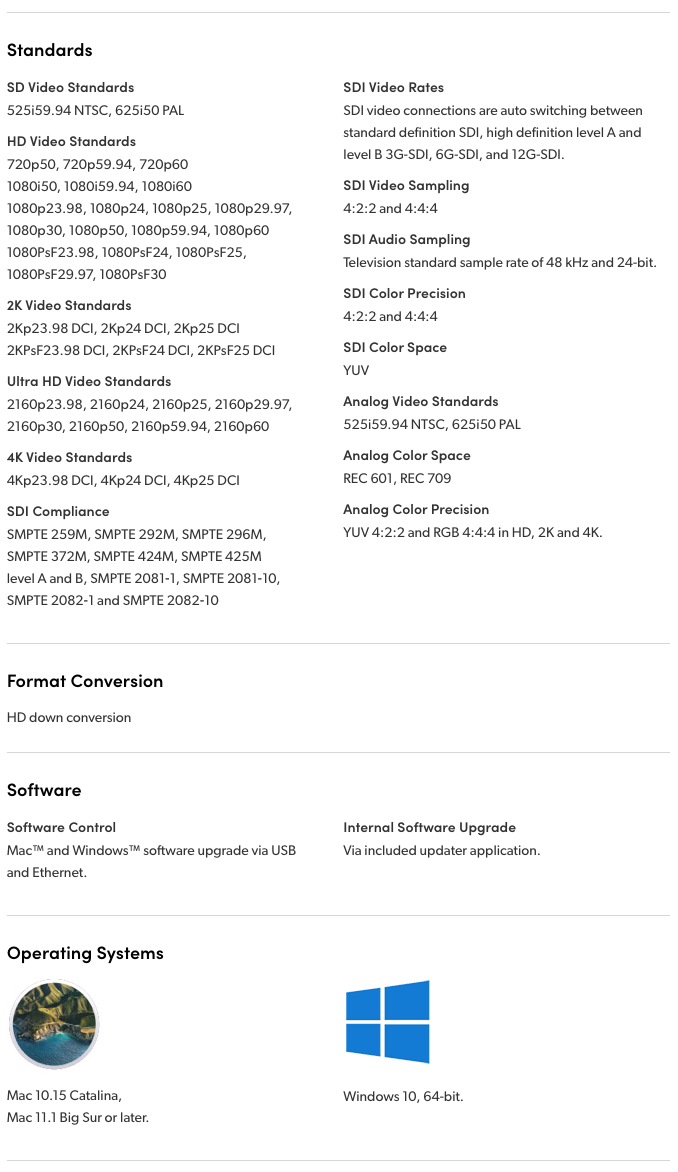 Convert from 12G-SDI to Analog. Use SD, HD, 6G and 12G-SDI rates and convert to analog video output. Built in down converter lets you connect Ultra HD sources to component video equipment in SD or HD. Allows you to connect analog equipment including Betacam SP, VHS, and video monitors.