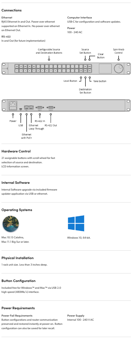 When you need to access your whole router without sacrificing speed, then Videohub Master Control Pro lets you scroll your router sources and destinations with the easy to use spin knob control or via direct button entry. You can even see all routes on the beautiful LCD! Powers via DC or the Ethernet connection!