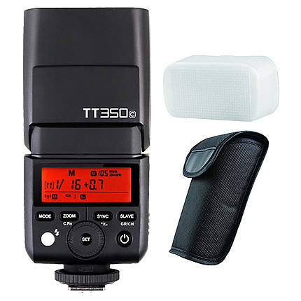 The Godox TT350C TTL Speedlite is a compact flash unit specially made for Canon digital SLR cameras. It features a 2.4 GHz X radio system, which supports 16 channels and 3 groups. The wireless flash can be set up as a master as well as a slave, and be triggered from a distance 30 m under the RF method and from 15 m under the optical-pulse method. Additionally, it has a 3.5mm port for synchronizing the camera or trigger through wired connectivity. The flashlights up all subjects within its range, thanks to the guide number of 118 ft at ISO 100 and at 105mm position. The TT350C prepares itself for the next shot in as little as 0.1 seconds and its shortest flash duration is 1/20000th of a second. The flash can rotate a full 270° and tilt from -7° to +90°. It runs on two alkaline or NiMH AA batteries that enable it to fire up to 210 full-power flashes.