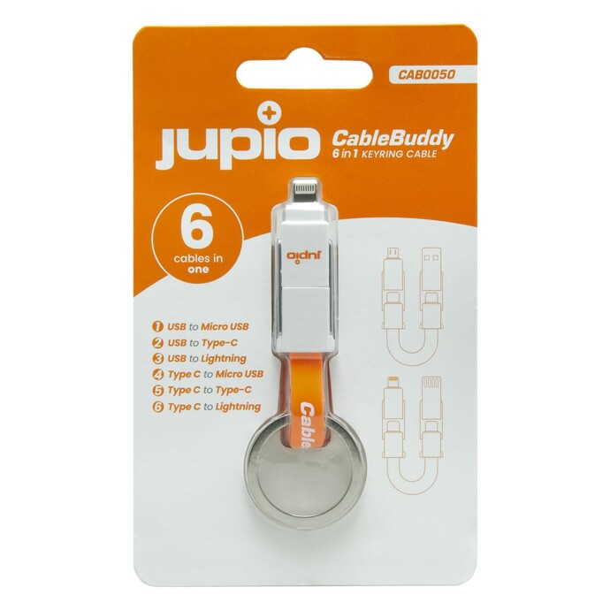 The Jupio CableBuddy is the super handy 6-in-1 USB cable that is small enough to attach to your key ring, yet versatile enough to power your device anywhere you go! The CableBuddy is equipped with multiple USB connections on both sides of the cable, making no less than 6 different combinations possible. Unlike similarly priced cables, the CableBuddy is capable of both charging and data transmission! 1. USB Type-A to Micro-USB 2. USB Type-A to USB Type-C 3. USB Type-A to Lightning 4. USB Type-C to Micro-USB 5. USB Type-C to USB Type-C 6. USB Type-C to Lightning Note: you can find the Micro-USB connector on the rear side of the lightning connector, just twist the cable around to reveal it!
