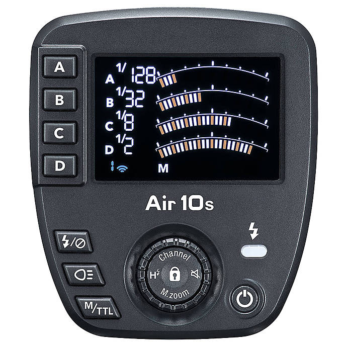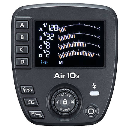 Control your wireless flash units from a distance with the Nissin Air 10s Commander. This wireless TTL commander is made for Canon cameras with E-TTL or E-TTL II support. It offers control for up to 328 feet with NAS-compatible flashes and receivers. The 2.4 GHz radio transmission uses eight channels and eight groups for communication. With the crossover TTL support, you can use Nissin Air System flashes with TTL systems. The commander can be used to adjust power from 1/1 to 1/256 and flash zoom from 24 to 200mm. When you use the memory function, it saves the setting of the TTL mode as you switch to the manual mode. You can use the AF assist beam when working in low light. The microSD card slot allows you to update the firmware.