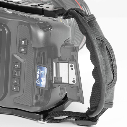 The Camera Cage for Blackmagic Cinema Camera 4K from SHAPE provides a formfitting base for attaching accessories, handles, or grips to your BMCC 4K. All controls, ports, and slots remain accessible when the cage is mounted to your Blackmagic Cinema Camera 4K. It gives you easy access to the memory card, the battery door, the lens release button and all other controls and outputs. The cage is designed with one cold shoe at the top to mount accessories like a microphone, magic arm (RPB2AHS), LED or Top Handle (DTH1). There is also multiple 1/4"-20, 3/8"-16 threaded holes with ARRI anti-twist threads to strongly secure the camera and accessories in place. Constructed from lightweight yet sturdy CNC-machined aluminum, the cage includes a left-side clamp to prevent your HDMI cable from accidentally disconnecting. A padded hand strap adds comfort when grasping the right side of the camera.