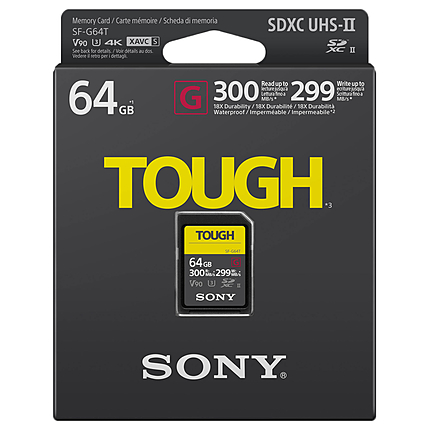 The Sony 64GB SF-G Tough Series UHS-II SDXC Memory Card is a blend of robust construction and high-speed performance that supports both image and video capture. Built for UHS-II compliant devices, the memory card provides a maximum reading speed of 300 Mbps and writing speed of 299 Mbps. With this Sony memory card, you can record videos in 8K, 4K, 3D, HFR, and Full HD. The V90 speed class rating ensures a minimum writing speed of 90 Mbps. The memory card can be used with UHS-I devices as well. This Sony SDXC card provides resistance against water, dust, X-rays, static shock, and magnetic field. The card can function in extreme temperatures from -13 to 185°F. You can download the free File Rescue software to retrieve lost files.
