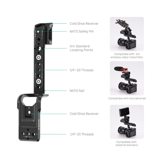 This Bracket allows you to mount additional accessories via Cold Shoe, NATO Rail, 1/4″-20 and 3/8″-16 threads with locating points.
