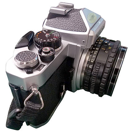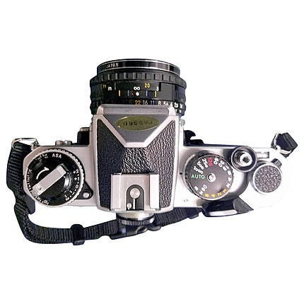 The camera takes pictures on a 35mm film negative. This camera has a single-stroke advance lever that offers 135° throw angle and a 30° stand-off angle. You may also use the advance lever as an on-off switch. The self-additive frame counter automatically resets to the ""S"" value when the camera back is opened. This camera has an option to use the MD-11 motor drive for automatic film winding.