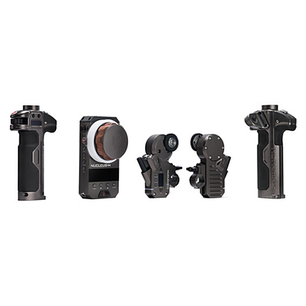 The Tilta Nucleus-M Wireless Lens Control System is designed with a maximum operating range of 1000 ft., and includes two lens drive motors with built-in receivers, as well as a FIZ hand controller, and two handgrips. The left handgrip is designed to control iris and zoom, while the left handgrip controls focusing control. Each lens drive motor features a cine-standard 0.8 MOD drive gear, as well as two 7-pin connectors, which allows you to swap or interchange each motor. The motors are powered by daisy-chaining via the 7-pin cables, & each motor includes a 19mm rod clamp (with 19-15mm adapter bushing).